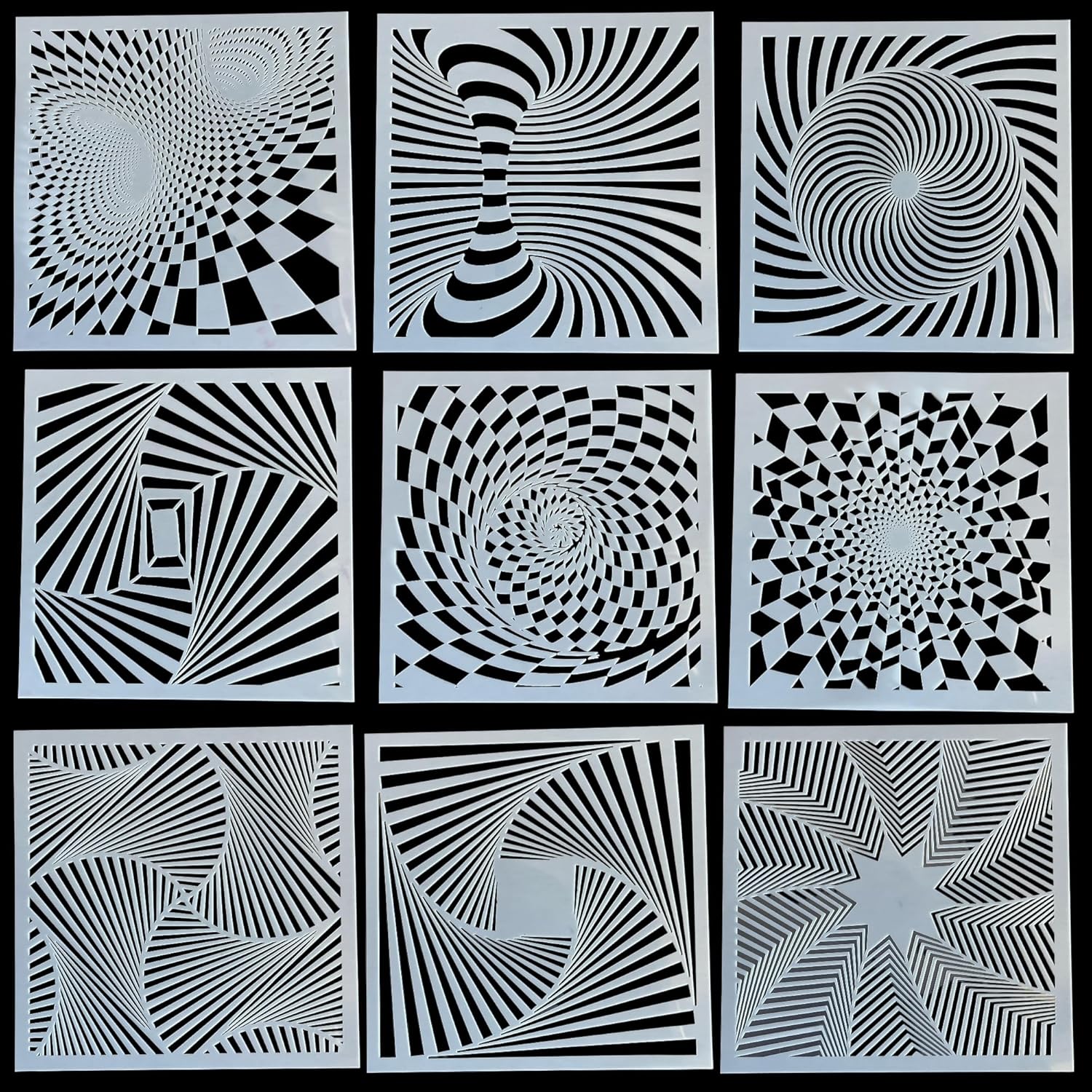 Introducing the LiME LiNE Reusable 3-D Illusion Airbrush Stencil Geometric Nine Pack - the ultimate solution for adding depth and dimension to your art projects!